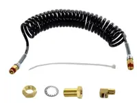 Sliding 5th wheel air hose kit KP155K for Kenworth, Peterbilt, International and Volvo/White applications. 1/4 inch hose with 1/4"-14 NPTF fittings. Coiled black nylon air hose with spring guard. Air cylinder to bulkhead fitting. Replaces Holland numbers RK250010 and RK-2500-10.
