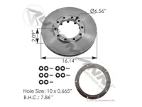 Air disc rotor 153.10041217 for Mack and Volvo drive axle. 16.141 inch outer diameter. Includes ABS tone ring. Five 1/4 inch ABS screws, ten 5/8 inch nuts. 10 bolt holes at 0.665 inch diameter. Replaces OEM numbers 22024043, 7413-10041217, CM10041217 and 22024043.