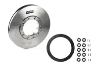 Air disc rotor 76801 is used on Wabco PAN 22-1, TN axles. U shape, 16.93 inch outer diameter, 1.77 inch thick, 2.09 inch overall depth, 10 mounting holes. Includes ABS ring, screws, and nuts.
