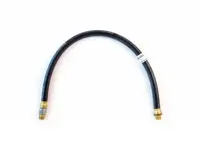 Sloan rubber air hose assembly 453226 is 26 inches long with a 3/8 inch inner diameter. The hose includes one fixed and one swivel 3/8"-18 brass fitting and meets SAE J1402 and DOT-106 certification. 225 psi maximum operating pressure. The permanent live swivel fitting retains the ability to swivel after installation.