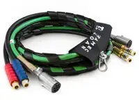 Sloan 3-in-1 air power wrap 451097 with black hose and nylon DuraGrip handles. 12 foot length, 3/8 inch rubber air hose lines with 1/2 inch adapter swivel fittings with springs, plus hanger clamp, carabiner, and sleeve. ElectraPlus 7-Way ABS electrical cord with green jacket. Meets SAE J844, DOT FMVSS standards.