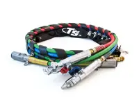 Sloan 3-in-1 air power wrap 451189 with red and blue hose and MAXXGrip gladhands. 12 foot length, 3/8 inch rubber air hose lines with 1/2 inch adapter swivel fittings with springs, plus hanger clamp, carabiner, and sleeve. ElectraPlus 7-Way ABS electrical cord with green jacket. Meets SAE J844, DOT FMVSS standards.