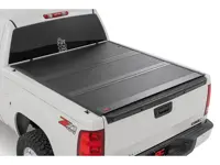 Rough Country tri-fold Tonneau truck bed covers provides a flush, low profile design that gives your truck a clean, sleek look while protecting the contents of your bed. The durable, aircraft grade aluminum cover features a premium, black textured finish for uncompromised protection and a great look.