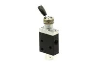 Manual air control valve 404811000. 3-way, 2 position, spring return. 150 psi maximum valve pressure rating. 1/8 inch NPT ports, normally closed.