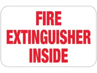 Fire Extinguisher Inside decal. Decal measures 4.5 inches x 6.75 inches in size. Large red lettering on a white background.