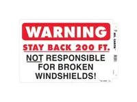 This caution decal warns drivers "Warning Stay Back 200 Ft.". Decal measures 11.75 inches x 17.25 inches in size. Black and red ink printed on white vinyl decal material.