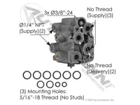 E7 dual circuit foot brake valve 170.284760. 1/4 inch NPT supply ports and no thread delivery ports. Has O-Ring sealed flange ports. 3/8 inch - 16 mounting holes. For Ford applications.