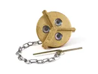 Sloan 2-1/8 inch brass fuel cap 431010. Vented, non-locking. 8.5 inch chain and cross-bar combination prevents loss of cap while refueling. 12 UN male threads, 3-1/2 inch cross bar.