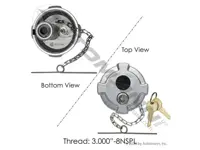 Aluminum fuel cap 572.1046 for Mack trucks. 3 inch, vented, locking, 8 NPSL threads. Includes two keys.