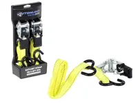 Ratchet strap 573.A108RS-2DP has vinyl coated hook sat each end and is 1 inch wide. The strap has a 1,500 lbs. rated capacity and 500 lbs. working load. Yellow color. 2 pack.