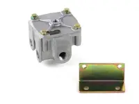 Bendix type R-12 relay valve. Horizontal 1/2 inch NPT supply and delivery ports and 1/4 inch NPT service port. 5.5 PSI crack pressure.