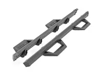 Rough Country's new Cab Length SRX2 side steps are the perfect upgrade for your Toyota Tundra. Constructed with an innovative slotted rail system, our hoop steps are easily adjustable. Simply slide the footpad left or right along the rail until it is at the perfect position to hop in and out. The aluminum adjustable steps are long-lasting, corrosion-resistant, and a high-quality option at an affordable price. Powder-coated for added protection from the elements, the SR2 aluminum steps and bar also improve the look of your truck by hiding the body pinch-weld and frame.