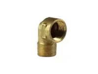 Yellow Brass Female Pipe to Male Pipe Street Elbow. 3/4 inch male threads, 3/4 female threads.