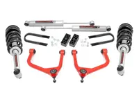 Rough Country 3.5 inch Suspension Lift Kit 110431RED for the 2WD/4WD Chevy Silverado 1500 achieves a perfectly leveled stance by lifting the front of your truck 3.5 inches and the rear 2.5 inches. The kit includes front lifted N3 struts, red forged aluminum upper control arms and rear lifted blocks.
