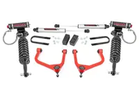 Rough Country 3.5 inch Suspension Lift Kit 110557RED for the RWD/4WD GMC Sierra 1500 with multi-leaf springs levels the front of your truck with the rear and offers enough increased ground clearance to run up to 33 inch tires with an improved, aggressive look. The kit features a set of red forged aluminum upper control arms, lifted Vertex Coilover struts and rear lift blocks. Add rear V2 Monotube shocks and you have the best of on and off-road performance.