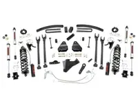 Rough Country 6 inch 4-link Coilover conversion suspension lift kit 58458 for the Diesel engine Ford F-250, F-350 Super Duty comes with everything you need for a total transformation of your truck. The kit features front Vertex coilovers, upper and lower control arms, radius arm drop brackets with rear lift blocks, add-a-leafs and V2 Monotube shocks.
