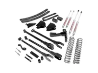 Rough Country 6 inch 4-Link Suspension Lift Kit 581.20 for the Gas Engine 4WD Ford F-250 and F-350 Super Duty with Overloads increases ground clearance and levels the front with the rear of the vehicle. The kit includes front lifted coil springs, fixed upper control arms, adjustable lower control arms and rear 3 inch lift blocks and add-a-leaf srings. Add in a set of front and rear Rough Country Premium N2.0 series shocks for the best performance for both on and off-road use.
