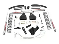 Rough Country 6 inch Suspension Lift Kit 597.20 for the 4WD Ford F-250 and F-350 Super Duty with Gas Engine features luxury ride coil springs matching OE coils rates. A heavy duty track bar relocation bracket properly centers the axle and matches the steering angles created by the supplied drop pitman arm while the radius arm drop brackets maintain the Super Duty's OE caster angles. A steering stabilizer relocation bracket maintains proper steering control but a RC problem solver single unit is recommended with larger tires and a RC dual stabilizer is required when running 37 tires. Add in front and rear Rough Country Premium N2.0 series shocks and you have the best performance for both on and off-road use.