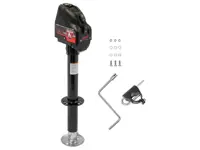The Bulldog A-Frame powered jack 500199 features 17 inches of travel, 9.75 inch bracket to ground retracted height and 4,000 lbs. of lift capacity. Includes black cover and drop leg. 3 LED lights allow easy setup at night.