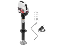 The Bulldog A-Frame powered jack 500200 features 17 inches of travel, 9.75 inch bracket to ground retracted height and 4,000 lbs. of lift capacity. Includes white cover and drop leg. 3 LED lights allow easy setup at night.