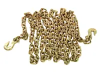 Grade 70 Yellow transport chain 573.KG703820 is designed for cargo securement, binding, towing and construction use. 3/8 inch x 20 feet long with clevis grab hook on both ends.